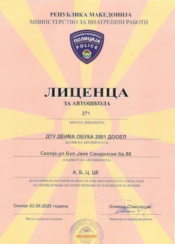 Авто школа ДЕИВА е основана 2001 година со единствена цел да од своите кандидати направи безбеден, вешт и совесен возач високо ниво на сообраќајна култура. Долгогодишното искуство ни потврдува дека квалитетниот начин на работа и задоволните кандидати за воазчи најдобар начин да како авто школа напредуваме. Задоволниот и одлично обучен кандидат е нашата најдобра реклама која ја добиваме уште од нашите почетоци што е причина за постојаниот наш успех, напредок и развој. Авто школа ДЕИВА ви нуди квалитетна и современа практична и теоретска обука за А, Б, Ц и ЦЕ категорија спроведена од страна на професионално обучени и лиценцирани инструктори, имено Авто школа Деива може да се пофали дека е една од првите школи чии што стручни кадри беа лиценцирани и добија лиценци како дел од измените и дополнувањата на Законот за безбедност на сообраќајот на патиштата се со цел зголемување на квалитетот на обуката и испитувањето на кандидатите за возачи, како и утврдување на индивидуална одговорност при евентуално незаконско постапување
